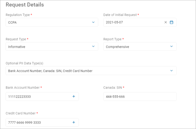 5) (Optional) In the Optional PII Data Type (s) fields, select the data types for the request.