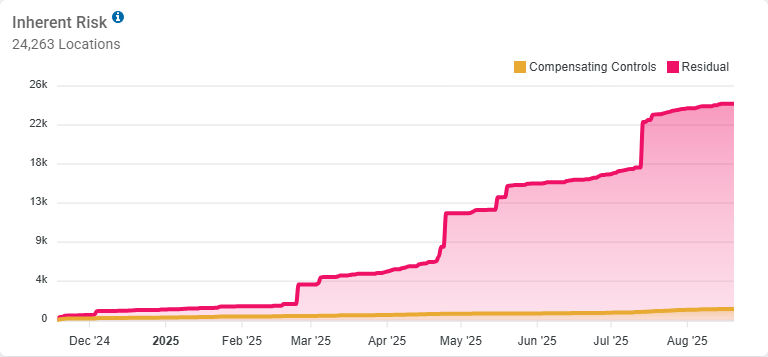 • High (and requires action) when Compensating Controls, represented by the amber shaded portion, lags behind Residual data.