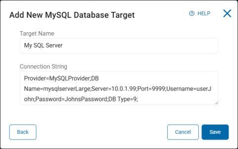 Sample connection string: Provider=MySQLProvider;DB Name=mysqlserverLarge;Server=10.0.1.99;Port=9999;Username=userJohn;Password=JohnsPassword;DB Type=9;