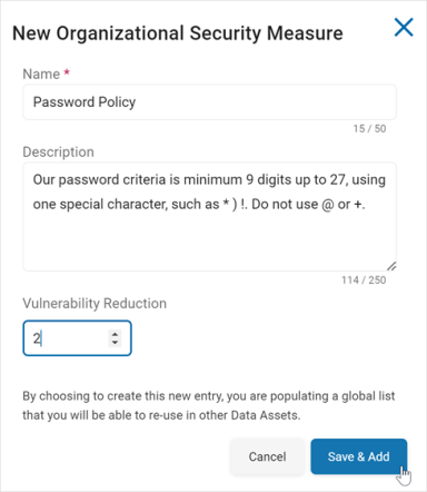 Vulnerability Reduction: Use the up-down number control to set a value of how much using this Security Measure reduces the vulnerability of the data. This can be valued from 1 (lowest) to 10 (highest).