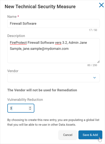 Vulnerability Reduction: Use the up-down number control to set a value of how much using this Technical Security Measure reduces the vulnerability of the data. This can be valued from 1 (lowest) to 10 (highest).