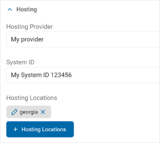 Hosting Locations: Click the blue +Hosting Locations button and select and click Add Location, search for existing locations, or click the blue +Hosting Locations button again to add a new location.