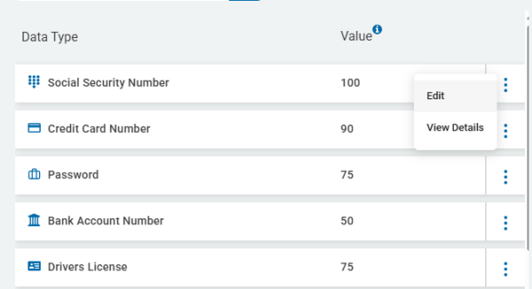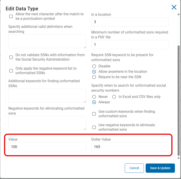For example, the Social Security Number Data Type is set to a dollar value of 165 ($165.00 per SSN instance).