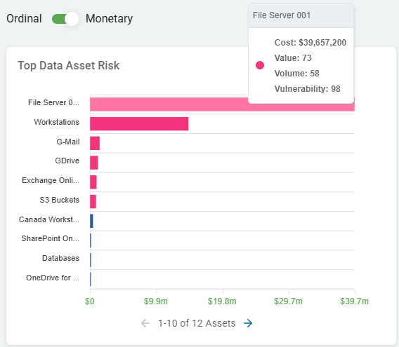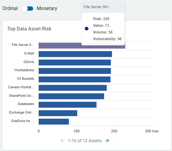 File Server 001 - In the example below data asset File Server 001 has the highest risk, with a total Ordinal risk score of 229 (out of 300):