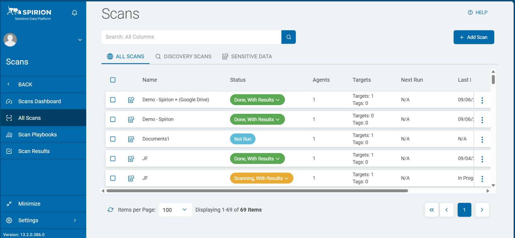 • Scans are the searches that agents perform on endpoints (targets) to find either the file locations (Discovery Scan) or find specific data types (Sensitive Data Scan) within the files and folders