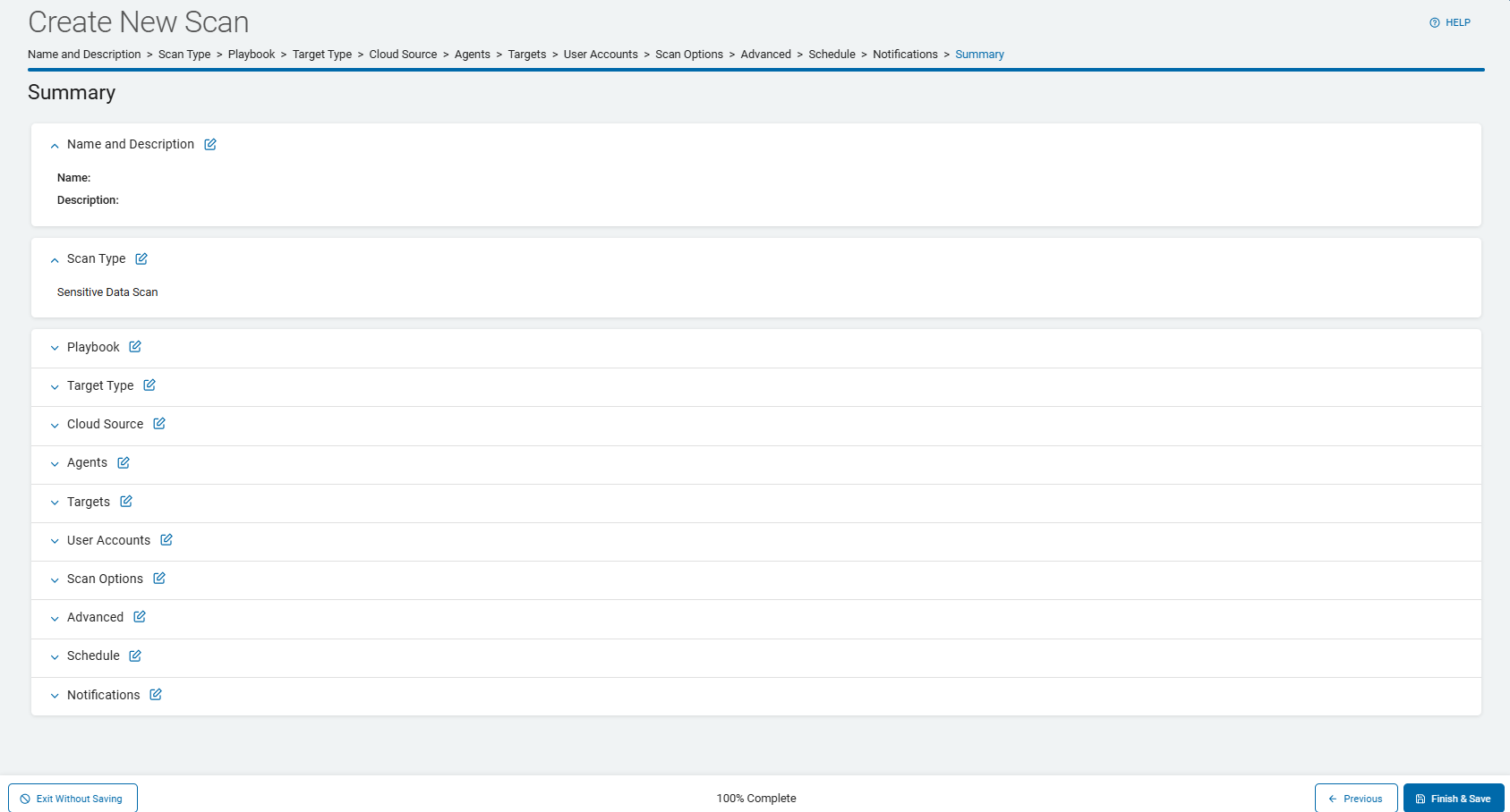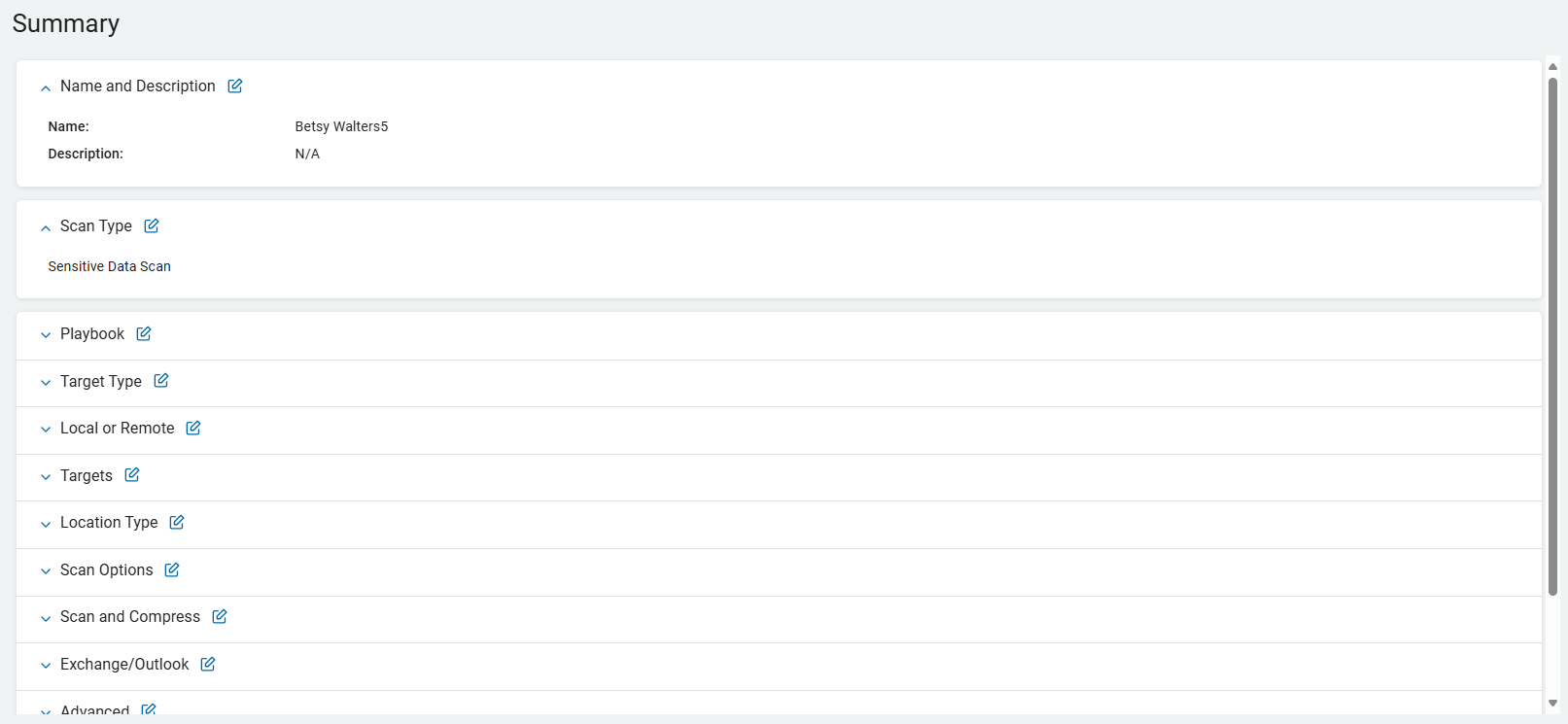 8. On the Summary screen, select the chevron (>) next to a section to open and review your scan settings.