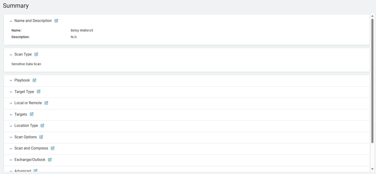 4. On the Summary screen, select the chevron (>) next to a section to open and review your scan settings.