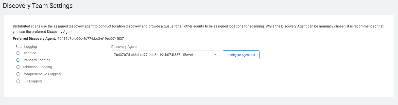 Note: Distributed scans use the assigned discovery agent to conduct location discovery and provide a queue for all other agents to be assigned locations for scanning. While the Discovery Agent can be manually chosen, it is recommended that you use the preferred Discovery Agent.