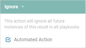 Ignore: Ignore all future instances of a result. Note that if you Ignore a via a Playbook, the Spirion agent reports the data, and then services adds an internal global ignore list so the data is not found again. With appropriate searching or filtering, ignored data is still visible in scan results and reporting. Sensitive data matches added to custom Global Ignore Lists that users create, results in Spirion agents ignoring that data and the data not being sent to the SDP console. The data is therefore not visible in scan results, reporting, or dashboards. See Manage Data Retention Settings