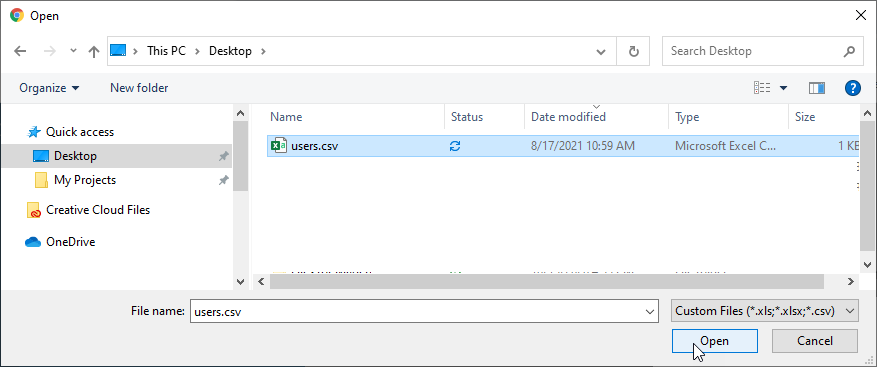 In the Import Users pop-up window: