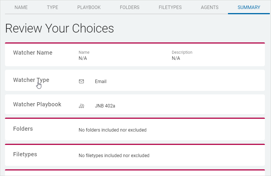 On the Summary tab, review your choices. Click a tab or section to navigate to the section to make changes.
