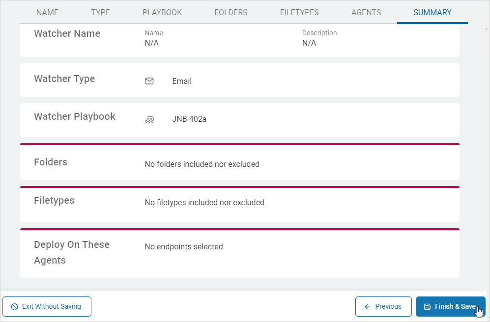 Click Finish & Save to save, Previous to return to the previous screen, or Exit Without Saving to discard.