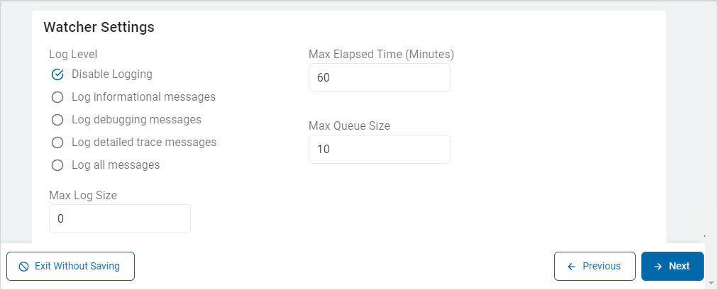 The Watcher Settings section display the following fields when folder is selected as a watcher type.